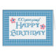 Een 100ste verjaardagsbloemen, met een blauw-wit ruitmotief en twee roze Kaarten. U kunt de binnengroet veranderen als u wilt.