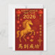 Vier het Jaar van het Paard in stijl met deze elegante 2026 Chinese Nieuwjaar wenskaart. Met een gedurfd galopperend gouden paard tegen een rijke rode achtergrond, geaccentueerd met traditionele lantaarns, vuurwerk en kersenbloesems, vangt dit ontwerp de geest van het Fire Horse-jaar - symbool voor energie, succes en geluk. Op de voorkant van de kaart staat "Happy Chinese New Year 2026" naast de Chinese uitdrukking 馬到成功 ("Succes komt met het paard"), terwijl de achterkant van de kaart een verfijnde rode en gouden begroeting biedt met de Chinese karakters 新年快乐 ("Happy New Year"). Perfect voor het verzenden van warme wensen naar familie, vrienden, klanten en zakenpartners, deze kaart combineert traditie met elegantie - waardoor het een aandenken is dat ze zullen koesteren. Trefwoorden: Chinese Nieuwjaarskaart, Jaar van het wenskaart 2026, Fire Horse, rood en goud Lunar Nieuwjaarskaart, 馬到成功, 新年快乐, Aziatische vakantiepas, feestelijke Chinese kaart, Zazzle wenskaart