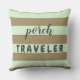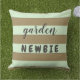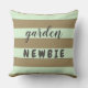 Een eenvoudig, stijlvol en grappig ontwerp! Horizontale strepen gekleurd pastelgroen, op een groene achtergrond die in kleur kan worden aangepast. De achtergrond heeft een pluizig filter dat kan worden verwijderd als u de voorkeur geeft aan gedurfde kleuren. Tekst zegt "garden NEWBIE" aan de ene kant en "porch TRAVELER" aan de andere kant. Tekst kan gemakkelijk worden aangepast om leuke en relevante alternatieven te creëer, misschien zelfs contrasterend aan elke kant van het kussen. Met verschillende kussens kan het zelfs een leuk spel worden. Het ontwerpidee komt op verschillende kleurversies met strepen gekleurd pastelgeel, pastelrood, pastelgroen, pastelblauw, wit, zwart of grijs.