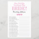 Dit mooie vrijgezellenfeesten spelletjesblad met How Old Was the Bride? op de voorkant en How Well Do You Know The Bride? op de achterkant is eenvoudig en charmant - perfect voor uw douche. Deze leuke en makkelijke spelletjes brengen zeker veel lach naar je vrijgezellenfeest! Laat familie en vrienden je afbeeldingen van de bruid sturen op alle verschillende leeftijden en laat ze printen. Nummer ze en zet ze in de buurt van deze spelbladen. Geef simpelweg een sheet aan elke gast (vergeet de pennen niet) en laat de competitie beginnen voor het eerste spel! Je zult verbaasd zijn hoeveel mensen echt de leeftijden van de bruid kennen. Vervolgens draai je het blad om en geef je gasten 5 minuten om de vragen te beantwoorden. Je zult erachter komen wie de bruid echt kent. In enkele seconden kun je zien hoe je spelletje eruit zal zien. Selecteer deze Sjabloon personaliseren en typ de namen van de bruid.