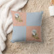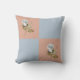 Vier vierkantjes twee met een bleek blauw-grijs enig roos ontwerp op de werpkussen.
