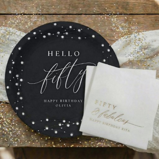 Celebrate a milestone birthday with this elegant Hello Fifty 50th birthday invitation. Designed in classic black and white, this modern invitation features refined typography and graceful script accents with subtle white glitter and soft string lights for a classy, adult look. The simple, polished layout makes it perfect for a sophisticated celebration.