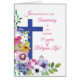 Groene bladeren, kleurrijke bloemen, een groot blauw kruis en woorden in roze. Dit is de elegante en mooie Religieuze kaart die je nodig hebt voor je felicitaties met een 55e Jubileum. Een goede non die van God en natuur houdt, zal je boodschap graag op deze manier ontvangen.