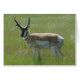 Gaffelbok kaart. Deze grote gaffelbok graasde in het weelderige lentegroen toen ik deze foto nam. Hij is zijn zware winterjas aan het verliezen voor een veel lichtere zomerjas om hem koeler te houden, zomertemperaturen in de Alberta prairies kunnen boven de 40 graden Celsius uitkomen.