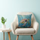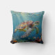 A sea turtle themed pillow with an illustration of a sea turtle under a calm teal sea swimming among the coral on the ocean floor with sun rays beaming down on him through the aqua water. Add a coastal feeling to your beach home!