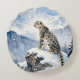 A pretty wildlife throw pillow with an illustration of a majestic snow leopard perched on a craggy, snow-covered peak, gazing out at a vast, frozen mountain range.
