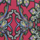 Magnificent design richly decorated with bright floral ornament in Italian Renaissance style. The design is made of hand-drawn flowers created in watercolor and black ink, the main background of the wallpaper is red and crimson, and the floral ornament is dominated by emerald green, sky blue and pastel purple colors.