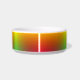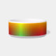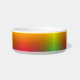 A white pet bowl with a gradient design featuring red, orange, and green hues wraps around its exterior. The colors blend smoothly, creating a vibrant and cheerful appearance.
