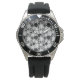 A wristwatch featuring a black band and a detailed black-and-white mandala pattern on the face, with a polished back. Modern and sophisticated design.