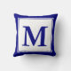Een groot blauw marinemonogram verschijnt op een witte achtergrond. Het monogram heeft een blauw-witte grens voor de marine. Pas de witte en blauwe kussen aan met uw initiaal/monogram.