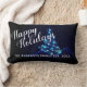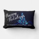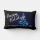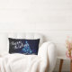 Kerstkussen met blauw boomontwerp klaar om je aan te passen met je familienaam.
