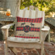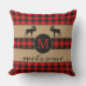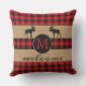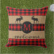 Fun en schattig in de openlucht gooien kussen met Welkomstgroet op een klassiek zwart en rood gevlekt vlakpatroon op de burlap achtergrond. Stijlvol, stijlvol, uniek ontwerp met ruimte om uw eigen familienaam monogram aan te passen of aan te passen. Oorspronkelijk gepersonaliseerd monogrammed buitendecor accent voor het versieren van de voorste veranda of de voortuin van uw landhuis, blokhut, bergkam, viskamp, meer- of riviervakantiehuis.