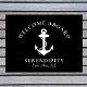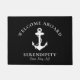 Een chic modern nautical-themed doormat voor je boot dat een witte illustratie van een anker op een zwarte achtergrond bevat. U kunt de tekst "Welcome Aboard" en de naam en locatie van uw boot personaliseren in elegante witte typografie.
