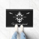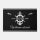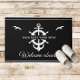 Een neutraal boarddoormat die je aangepaste bootnaam leest, omringd door een goed en anker van een schip op modern zwart-wit met zeegarens en een tweede regel tekst die klaar is om gepersonaliseerd te worden.