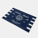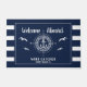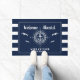 Welkom aan boord! Een standaard boating doormat die je aangepaste bootnaam leest en omringd wordt door een kompas met een anker op moderne blauwachtige strepen met zeemijlen en een tweede regel tekst die klaar is om gepersonaliseerd te worden.