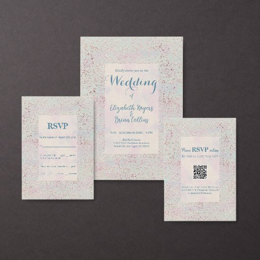 Unieke, stijlvolle RSVP-kaart voor bruiloft met koperspatten textuuraccenten lijst op zacht blauw en roze achtergrond met blauwe tekst. Een zeer delicaat en zacht kaartontwerp. Het ontwerp omvat het aantal gasten en de keuze van de maaltijden tijdens de huwelijksceremonie.