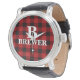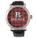 Dit ontwerp heeft een rood en zwart tartan patroon, samen met een monogram in het midden van het horloge. Je kunt dit object personaliseren met de achternaam van je initiaal en familie door de aangepaste sjabloon te gebruiken.