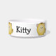 Een gepersonaliseerde kom voor je katachtige vriend met een schattige cartoon aan de zijkant van de kom met de naam zowel op de voor- als achterkant geschreven. Verander de naam van je eigen kat - een perfect cadeau voor een kattenliefhebber.