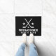 Aangepaste klepmat met kruiste ijshockeysticks en puck. Zwart-wit tapijt met persoonlijke familienaam of persoonlijke tekst. Athletische typografie met sportief logo. Verkrijgbaar in kleine en grote afmetingen. kleuren.