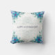 Elegante "Happy Retirement"-kussen met de naam van de gepensioneerde werknemer op de rug, samen met de maand en het jaar van hun pensionering. De kussen hebben een elegant bloemig lijst blauwe bloemen met blauwgroene bladeren.