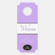 Groet uw gasten met deze deurhanger die de plaats inneemt van een welkomstmat in het huis, appartement of hotelkamer. Hier afgebeeld in een spritely tint van orchidee paarse met coördinerende witte en zwarte kleuringen. "Welkom" tekst op de voor- en achterkant met een kleine ovale en zilvergrijs gekleurde tiara-kroon binnen, gebruik de filteroptie voor zilveren kroon als u dat wenst. Gepersonaliseerde lijn voor uw optocht naam, uw titel of andere speciale moto of verklaring. Pas dit object aan of koop zoals in de afbeelding.