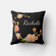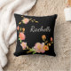 Drijfkussens met een zwarte achtergrond met oranje roze en groene bloemen en een speciale voornaam-monogram