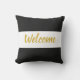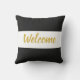 Een brede, witte gestreepte gaat over dit zwarte kussen, waardoor een zwarte streep aan de boven- en onderkant ontstaat. Het kussen heeft een klassiek zwart-wit kleurenschema. Personaliseer het werpkussen met de gewenste tekst in faux gold-script. (De tekst luidt momenteel 'Welkom').
