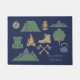 Voeg eenvoudig de naam van uw favoriete kampeerterrein en de staat toe waarin u uw eigen souvenir camping doormat kunt creëer, of voeg een familienaam of andere tekst toe aan de creëer van uw aangepaste welkomstmat voor uw vakantiekamer met een collage van kampeerscènes en buitenuitrusting in oranje, tint, lichtblauw en groen tegen een blauw marinekust. Het maakt een gave cadeau voor kampeerders en iedereen die van de grote buitenwereld houdt. Er zijn illustraties van bergen, een tent, een kampvuur, een lantaarn, wandelschoenen en nog veel meer.