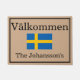 Deze douane-deurmat of deklaag is voorzien van een afbeelding van de vlag van Zweden in het midden op een beige gekleurde achtergrond. Bovenaan op het tapijt staat: "Välkommen", Zweeds voor "welkom" en vlak boven de Zweedse vlag gedrukt. De vlag is een vetgedrukt en eenvoudig blauw met een geel kruis. De naam van een voorbeeldfamilie wordt dicht bij de onderkant afgedrukt. U kunt dit model personaliseren en uw eigen familienaam, bedrijfsnaam, of douanebericht of citaat toevoegen. De mat is voorzien van een zwarte gedrukte rand.