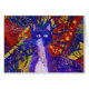 Een paars tuxedo-kat zit met zijn poten netjes gevouwen. Achter hem vormen rode, gele, oranje, blauwe en groene kleurpleisters een heerlijke en levendige achtergrond. Knipperen van ledematen, critici, amberkleurig en violet strekken zich door het schilderij. Driehoeken, stippen, strekken en cirkels lopen door de freckles in de hemel. Er zijn lavender- en digo-tranen voor zijn overlijden, ook al is er veel vreugde bij zijn komst.