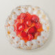 Beschikt over een aardbei shortcake met een centrum van glinsterende rode aardbeien omringd door bloemvormige pufjes slagroom. In kleuren of rood en wit.