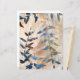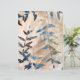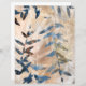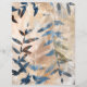 Abstracte gelaagde bladeren en gemengde media markeringen in een blauw en neutraal kleurenpalet.