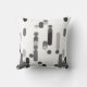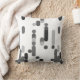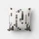 Dit moderne kussen heeft een abstract patroon met ronde geometrische vormen in zwart en grijs op een witte achtergrond.