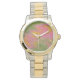 DEZE TWEETONIGE HORLOGE SPORTEN EEN DIGITAAL GEMANIPULEERDE FOTO MET ALS RESULTAAT EEN AANGENAAM ABSTRACT ONTWERP MET STALEN VAN ROZE, GEEL EN GROEN.