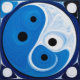 Een moderne afbeelding van yin yang in de kleuren blauw en wit tegen een achtergrond van rustgevende cirkelvormige geometrische vormen, die de balans van tegengestelde energieën in het hedendaagse leven symboliseren.