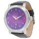 Een paarse en roze horloge met een abstracte waterverf achtergrond met gloeiende hoogtepunten. Deze levendige waterverven mengen zich en vormen samen een eenvoudig, minimalistisch, levendig en dynamisch ontwerp. Kloknummers / wijzerplaat zijn witte cijfers in een art deco lettertype.