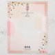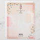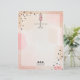 Lijntekening van de vorm van de jurk met roze penseelstreek en zwarte verfspat. Achtergrond is roze abstract geïnspireerd design met stippen linksboven en rechtsonder.