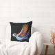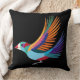 Een levendige en kleurrijke vogel wordt afgebeeld in het midden van de vlucht, met een opvallende reeks felle oranje, blauwe en groene tinten op zijn vleugels en lichaam. Het geometrische ontwerp voegt een modern en abstract tintje toe. Zwarte achtergrond