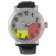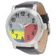 Dit mannen horloge heeft een ontwerp van gebroken zwarte lijnen die verticaal lopen in rechthoeken van lichtblauw, groen, blauw, geel en rood. Wil je verschillende kleuren? Stuur me een bericht.