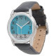 Dit mannen horloge heeft een geometrisch ontwerp van een grote blauwgroen rechthoek in de linkerbovenhoek, donkerdere blauwgroen strepen in de rechterbovenhoek, een lichtere kleinere blauwgroen rechthoek onder de strepen en zwarte lijnen aan de onderkant. Als je van het ontwerp houdt, maar de voorkeur geeft aan verschillende kleuren, stuur me een bericht.