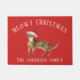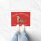 Schattige kerstdeurmat met een Abyssinische kat met een kerstmuts op een feestelijke rode achtergrond.