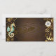 Bruine houten ondergrond met zee, mechanische kam, een antiek stuurwiel, een gouden anker en diverse gouden en messing tandwielen. Steampunk.