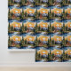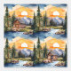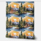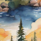 Waterverf hut in het bos met bontpijnbomen, loopkreek, bergen en zonsondergang behang.