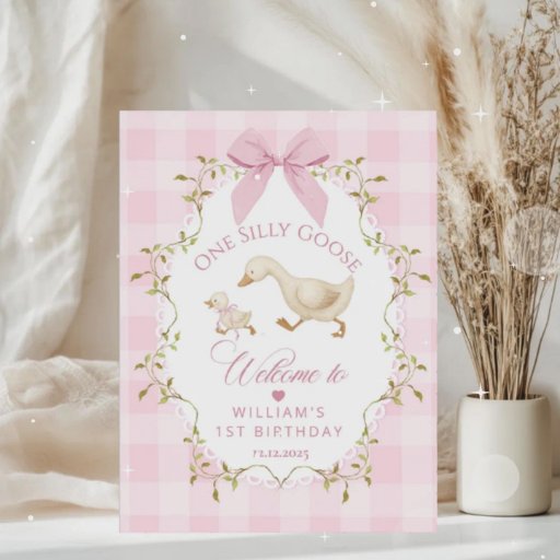 Adopt A Silly Goose Pink Gingham 1st Birthday Poster