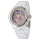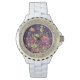 Elegant afbeelding op een horloge van oceaanwezens op een paarse achtergrond.