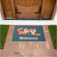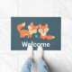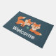 Een welkome deurmat met een afbeelding van 2 oranje vossen die er schattig en vrolijk uitzien. Donkergroene achtergrond.