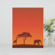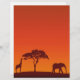 Afrikaanse safari-landschapsachtergrond met silhouettes van een giraffe, een boom en een olifant tegen de zon in oranje en rode tinten.