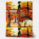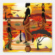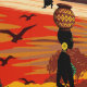 Mooie vrouw African Silhouette gekleed met was traditionele stoffen jurk, met een hand gemaakt versierde pot, Wandelen in de verbazingwekkende Natuur van de African Savanna, op een warme en vredige zonsondergang. Originele vectorillustratie Copyright BluedarkArt TheChameleonArt.