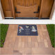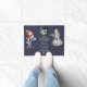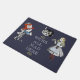Een grappig portret voor kattenliefhebbers en fans van het boek Alice's avonturen in Wonderland door Lewis Carroll. Onder een zwarte en witte illustratie van het grijze Cheshire Cat-teken staat het beroemde citaat van de excentrieke feline 'We zijn hier allemaal kwaad' in witte letters, onderaan en bovenaan met een decoratief motief. Beide zijden zijn illustraties van de Mad Hatter en Alice, elk met een aanraking van tartan in hun outfits. De Mad Hatter neemt een hap uit zijn boterham en zijn theepot. Alice houdt het magische flesje vast met het label Drink me. De oorspronkelijke tekeningen van kunstenaar John Tenniel waren zwart-wit. Ik heb een kleurstreepje toegevoegd aan alle drie. U kunt de donkerblauwe achtergrondkleur en het citaat veranderen om met de aanpassingsknoop aan te passen. De deurmat zou een groot geschenk zijn voor een nieuw thuis of cadeau voor huisverwarming voor vrienden en familie.