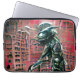 Giant groen metallisch buitenaards wezen dat een metropolitane stad binnenvalt. Wombo Dream AI en samenwerking tussen kunstenaars.
